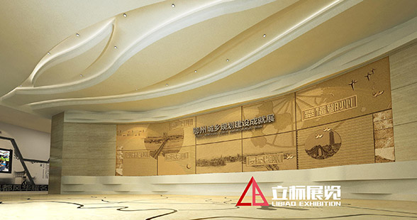 序廳設(shè)計簡潔高雅而不失恢宏大氣,天花以婉轉(zhuǎn)流美的曲線勾勒出奔騰的長江意象,與地板上的寫意地圖上下呼應(yīng),讓觀眾在俯仰之間感受鄂州通江達(dá)海的優(yōu)勢區(qū)位和襟江帶湖的水韻氣質(zhì)。迎面的主題形象墻上,連綿的曲線猶如長江之波,溫潤著這座秀美的城市。波浪之上,厚重的浮雕鋪展開以“五個鄂州”為主題的壯美畫卷,山水掩映間,一座宜居宜業(yè)的組群式大城市正呼之欲出。
